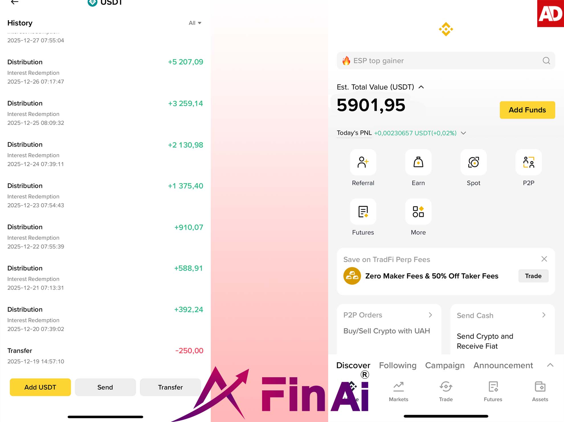 De volgende ochtend, toen we inlogden op het account, zagen we dat het saldo op het platform al 383,53$ bedroeg - 133,53$ meer dan het oorspronkelijke stortingsbedrag. Dat maakte ons natuurlijk blij, maar het belangrijkste was: controleren of we dit geld ook daadwerkelijk konden opnemen. Daarna koppelden we ons Binance-account aan FinAI, en het saldo werd succesvol verbonden met de Binance-wallet.